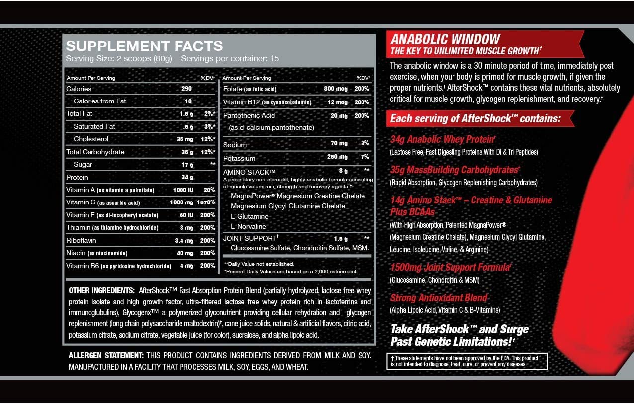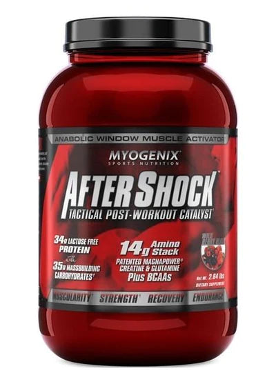 Myogenix's AfterShock is one of the best recovery products available! With 34g of protein, 35g of carbs, and 14g of BCAAs, this product will give your muscles the exact nutrition it needs to recover and grow stronger. Myogenix was not messing around with this product and it shows! This product will help get passed any plateaus and limits you may be feeling. Give your body what it needs!